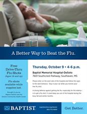 Baptist Memorial Hospital-DeSoto and DeSoto Community Health Center will offer free influenza vaccines to community members 18 years old and older in the hospital’s West entrance drive at 7601 Southcrest Pkwy. on Thursday, Oct. 9 from 4 p.m. to 6 p.m. No appointments are necessary, and attendees can arrive as early as 3:30 p.m. for the drive-thru line, which will start on the south side of the hospital.